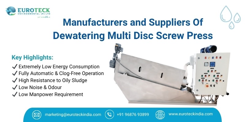 The Multi-disc Screw Press dewatering system developed by Euroteck Environmental Private Limited assists companies in managing costs and optimizing waste management processes through its high-performance, environmentally friendly technology.